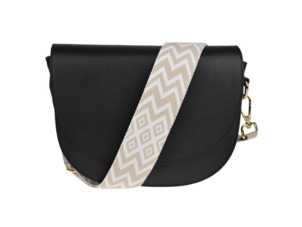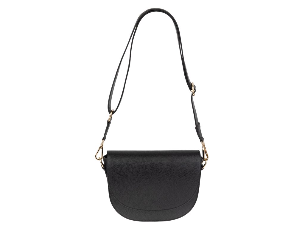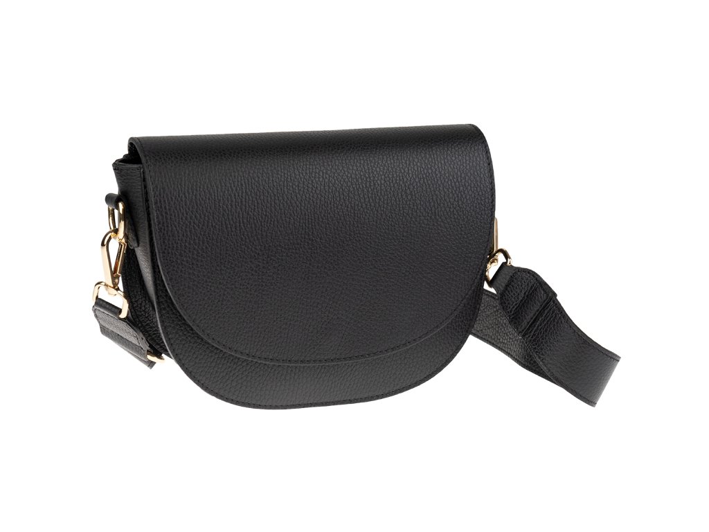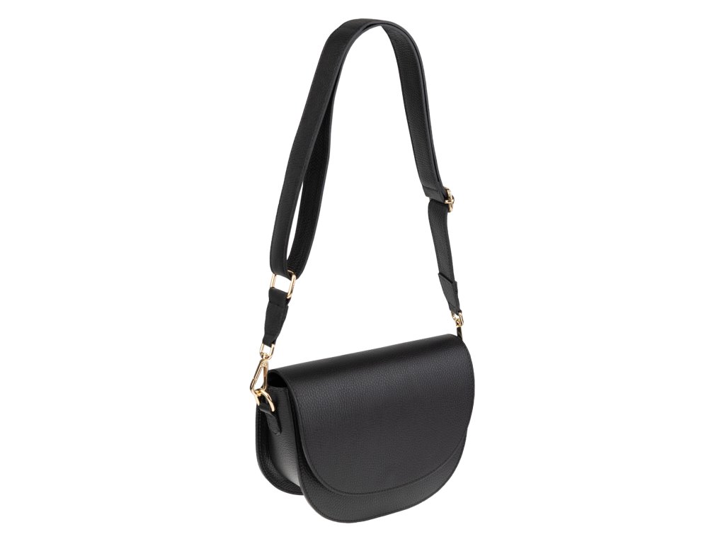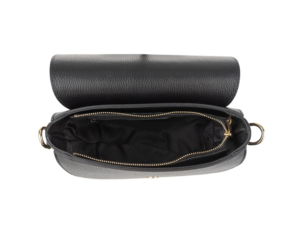 Čierna kabelka nositeľná cez rameno či cross-body (krížom). Táto kožená kabelka je uzatvárateľná na patentku a vnútri nájdeme priehradku na zips.