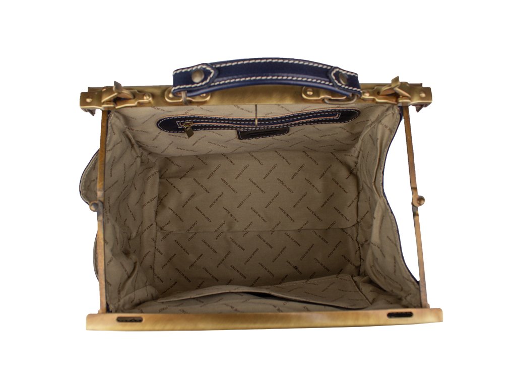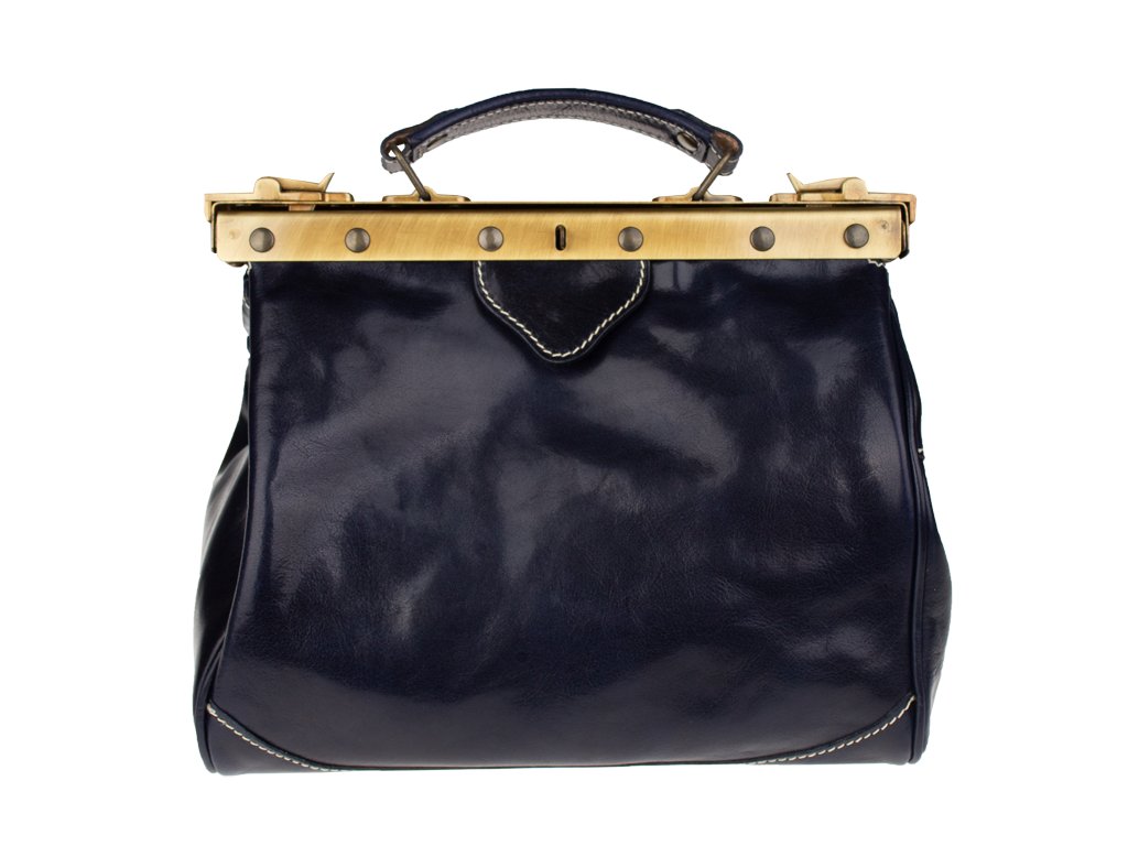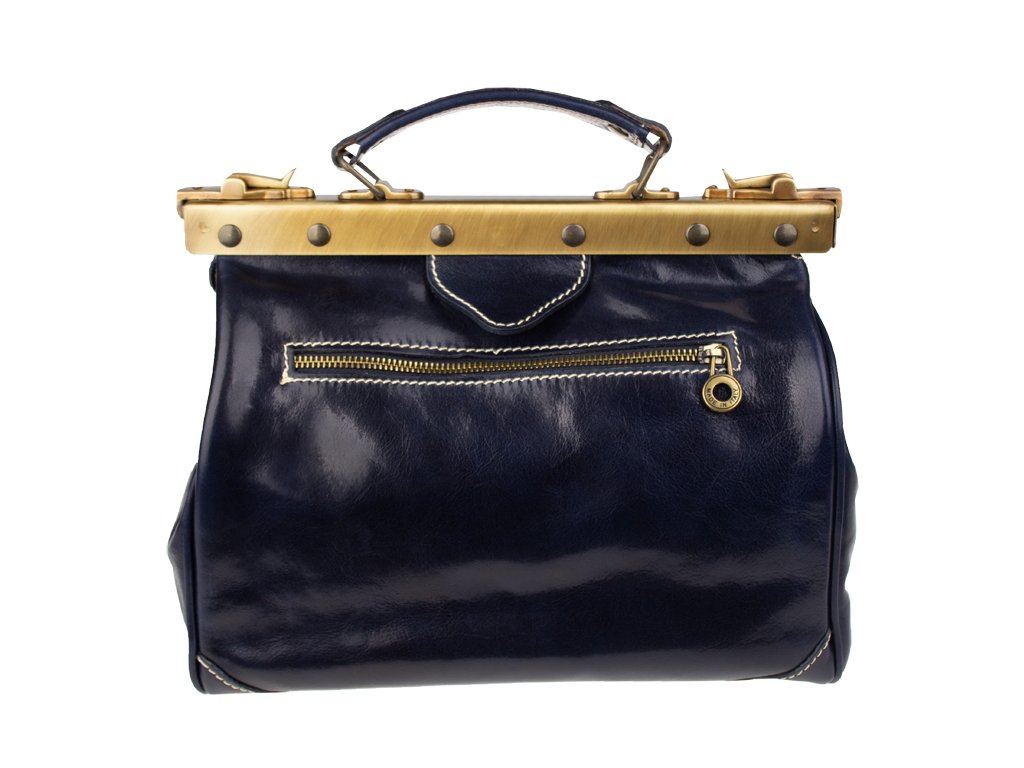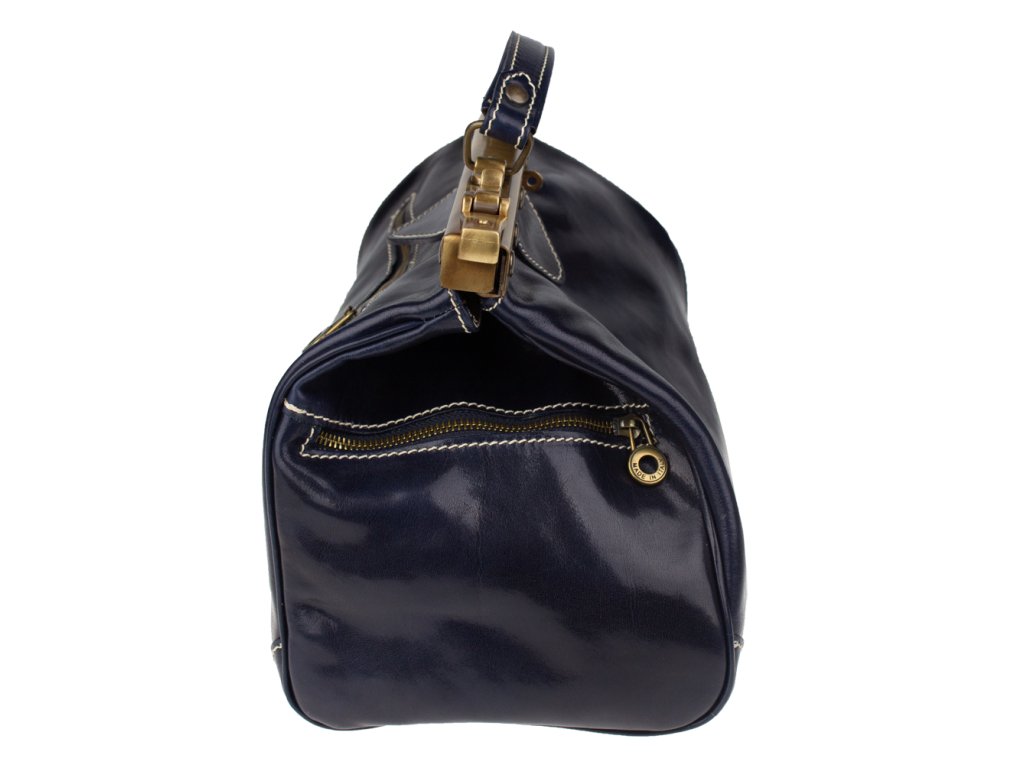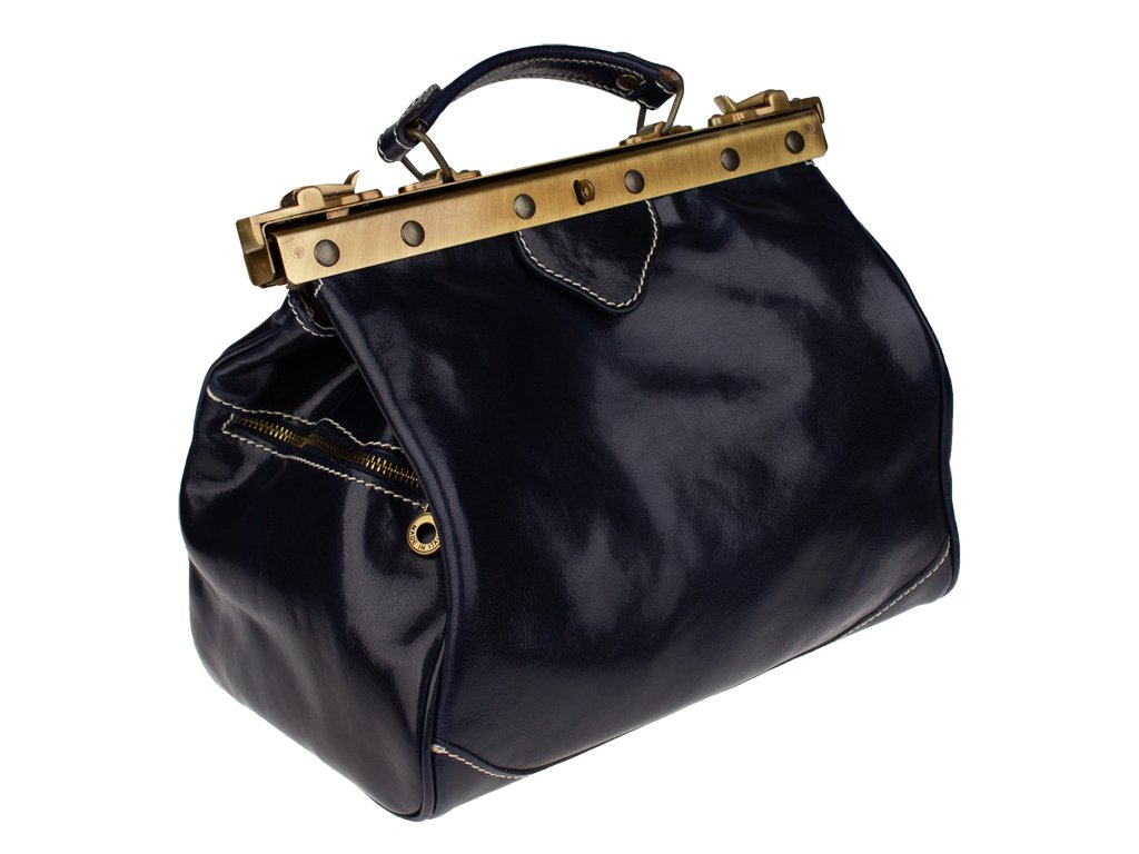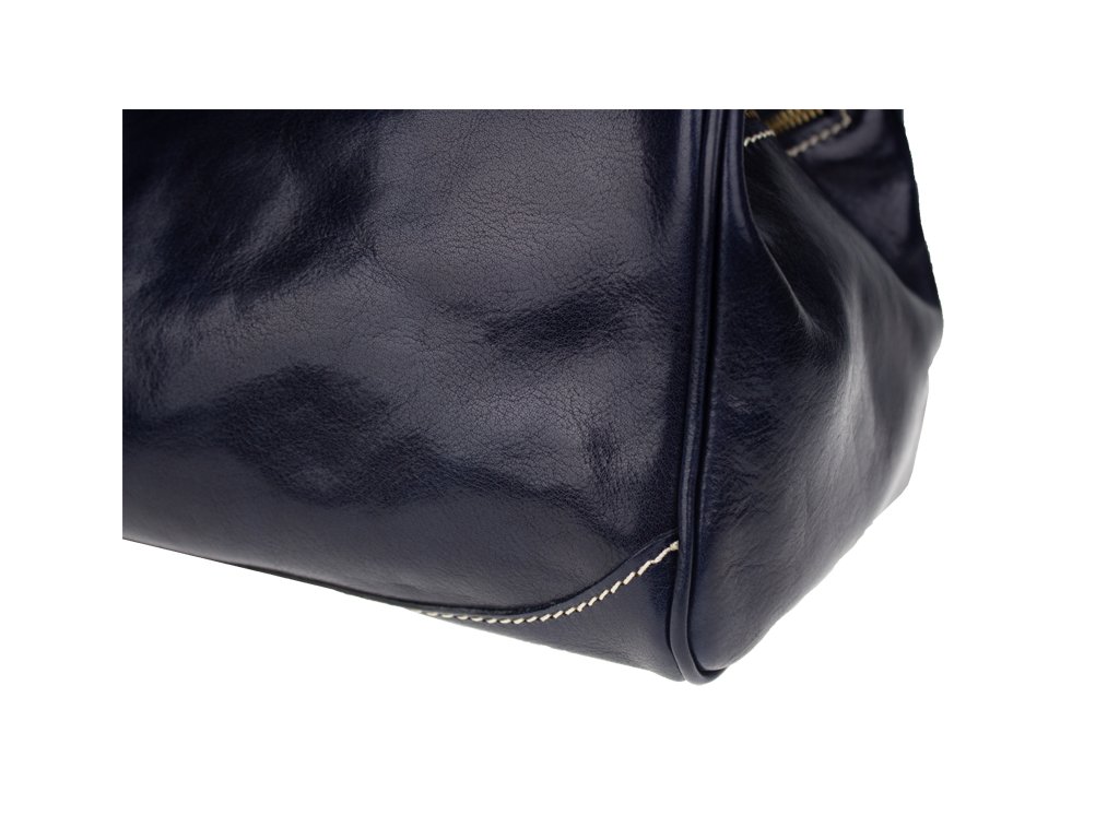 Jedinečná a elegantná kabelka s klasickým designom v modrej farbe. Je vyrobená z pravej hladkej kože. Kabelka je vhodná na nosenie do ruky, prípadne cez rameno s použitím prídavného popruhu. Kabelka sa uzatvára neobyčajným spôsobom, vďaka ktorému v nej budú Vaše veci v bezpečí. Na bočných stranách kabelka disponuje praktickými vreckami so zipsom a vo vnútri ponúka dostatok úložného priestoru, súčasťou ktorého je i vrecko na zips na stene kabelky.