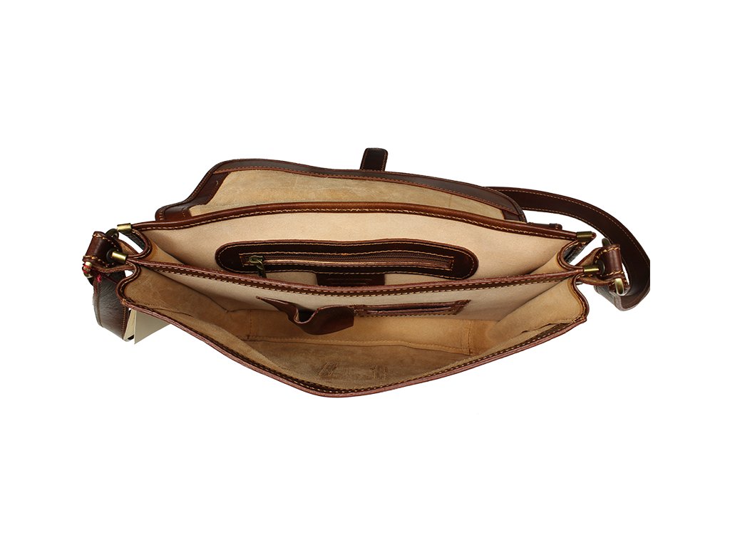 Nádherná kožená vintage kabelka v hnedej farbe so zipsovacím vreckom na zadnej strane a jedinečným nápaditým zapínaním. Vnútro kabelky je rozdelené na dve časti a disponuje malým vreckom na zips a koženým doplnkom na uloženie pier. Kabelku môžete nosiť cez rameno alebo crossbody (krížom).