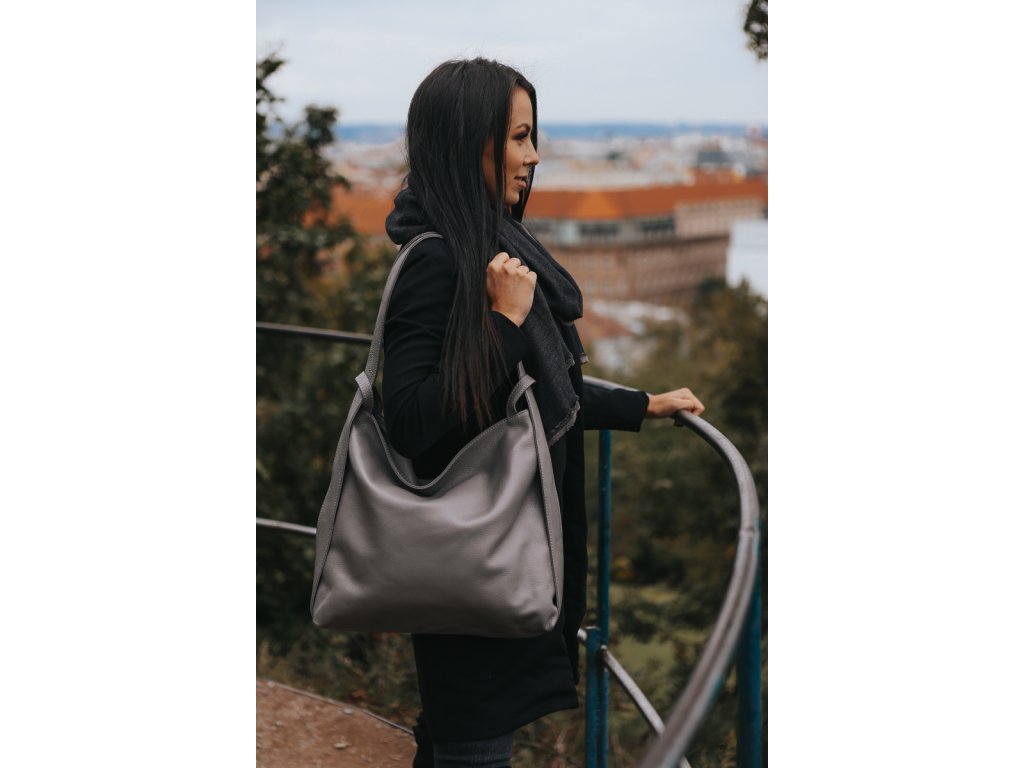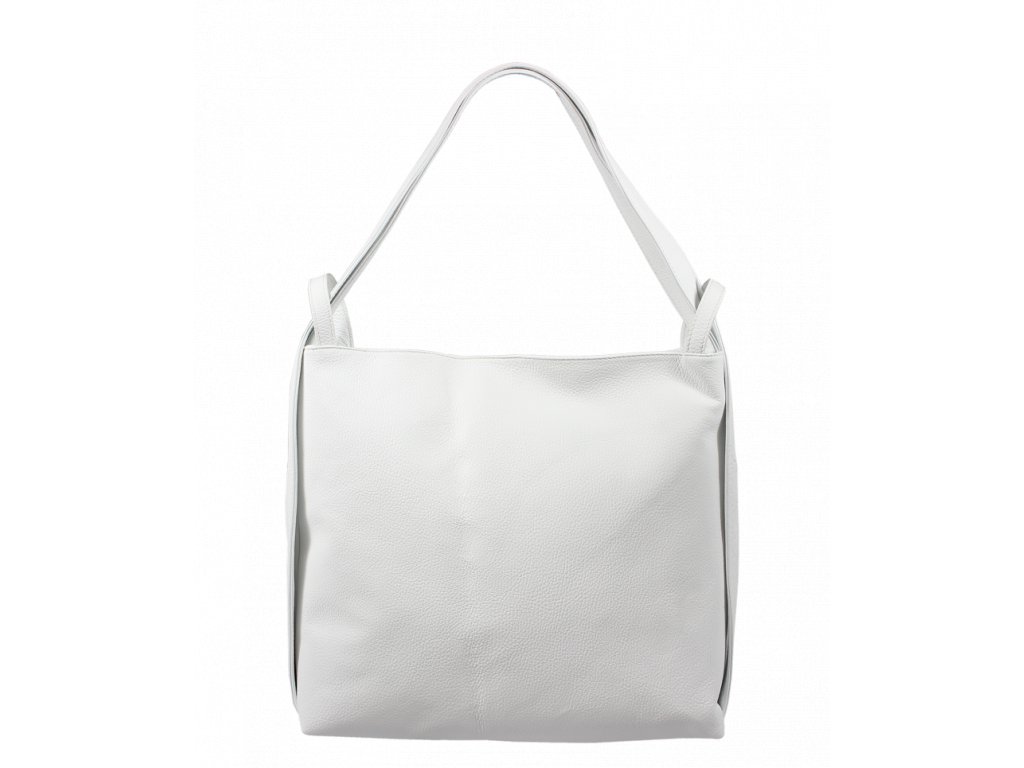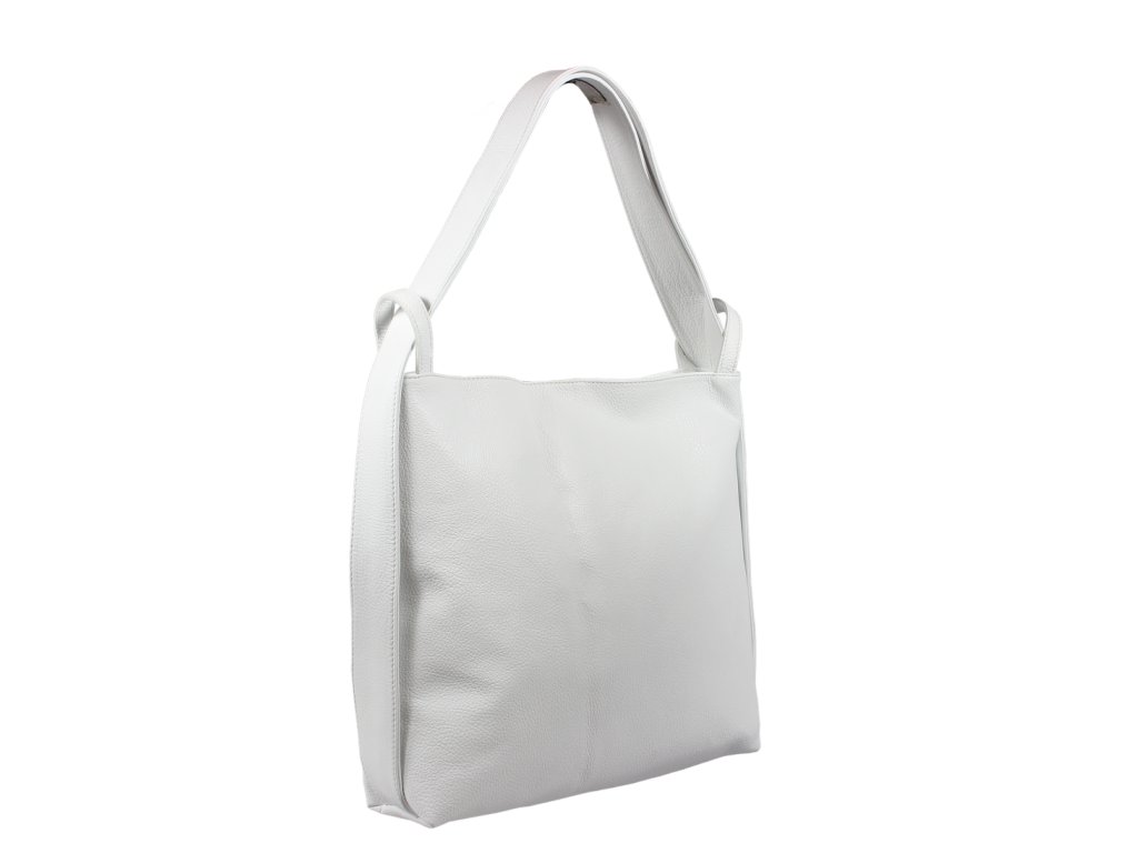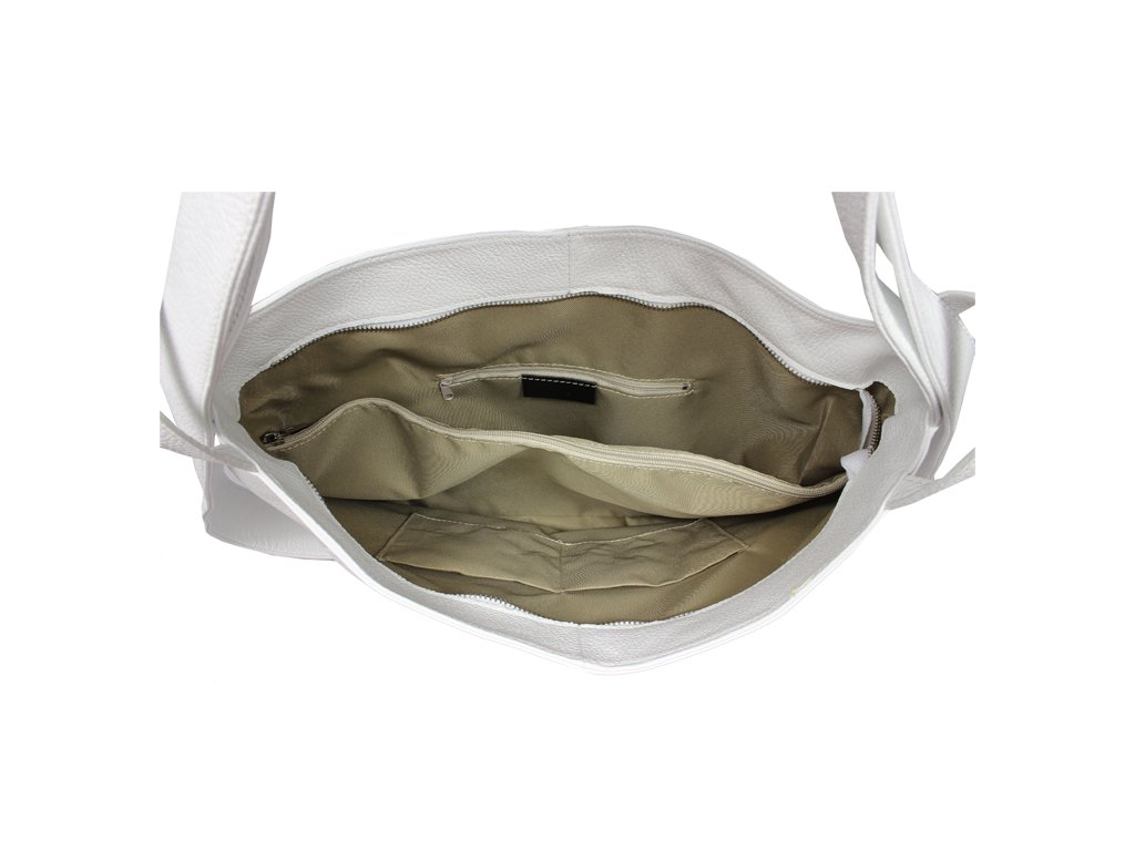 Krásna kožená kabelka s jednoduchým dizajnom v bielej farbe. Táto kožená kabelka je uzatvárateľná pomocou zipsu. Disponuje pohodlnými ušami dostatočnej dĺžky, takže jej možno nosiť pohodlne cez rameno alebo ako batôžtek. Pohodlne sa do nej zmestia dokumenty formátu A4.