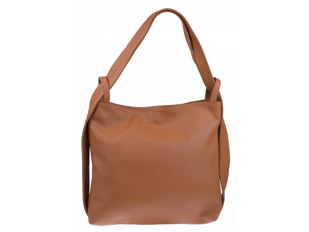 Krásna kožená kabelka s jednoduchým dizajnom v camel farbe. Táto kožená kabelka je uzatvárateľná pomocou zipsu. Disponuje pohodlnými ušami dostatočnej dĺžky, takže jej možno nosiť pohodlne cez rameno alebo ako batôžtek. Pohodlne sa do nej zmestia dokumenty formátu A4