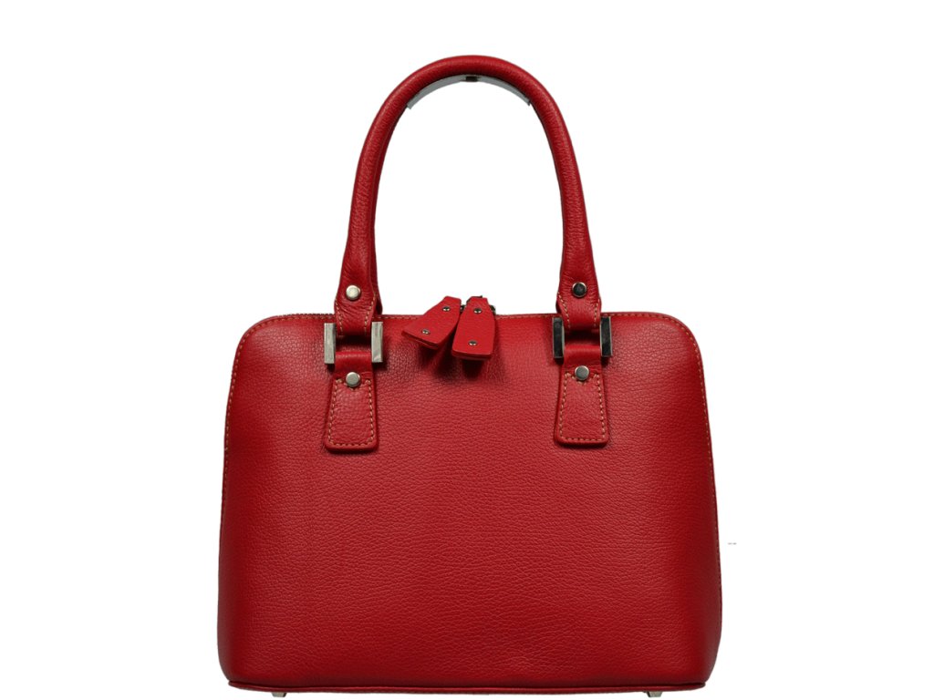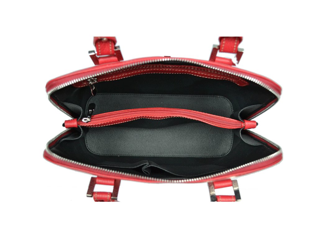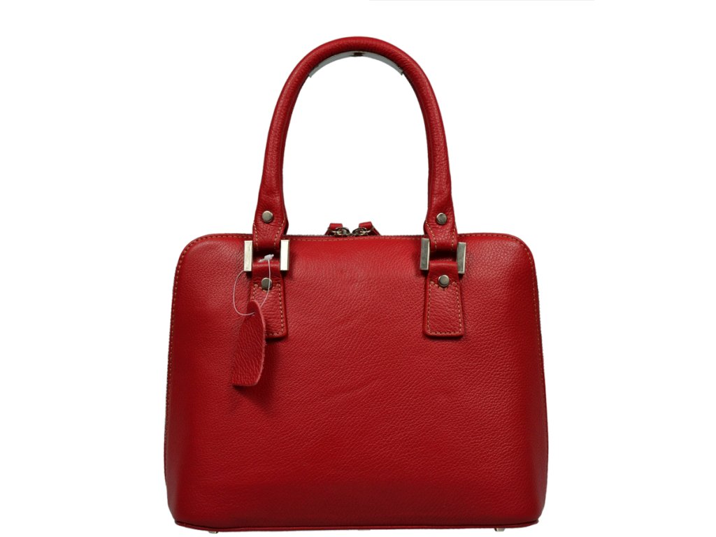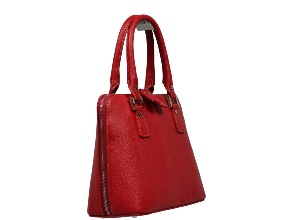 Menšia kabelka moderného dizajnu v červenej farbe je veľmi kvalitne spracovaná. Je vhodná pre nosenie do ruky. Táto kožená kabelka je uzatvárateľná na zips, ktorý sa rozopína po celom jej obvode. Kabelka je vyrobená z odolnej kože a dobre drží tvar. V jej vnútri je priečka slúžiaca aj ako vrecko na zips, na bočných stenách nájdeme ďalšie vrecko so zipsom a dve malé priehradky. Kabelka má naviac nastaviteľný popruh s maximálnou dĺžkou cca 120 cm.