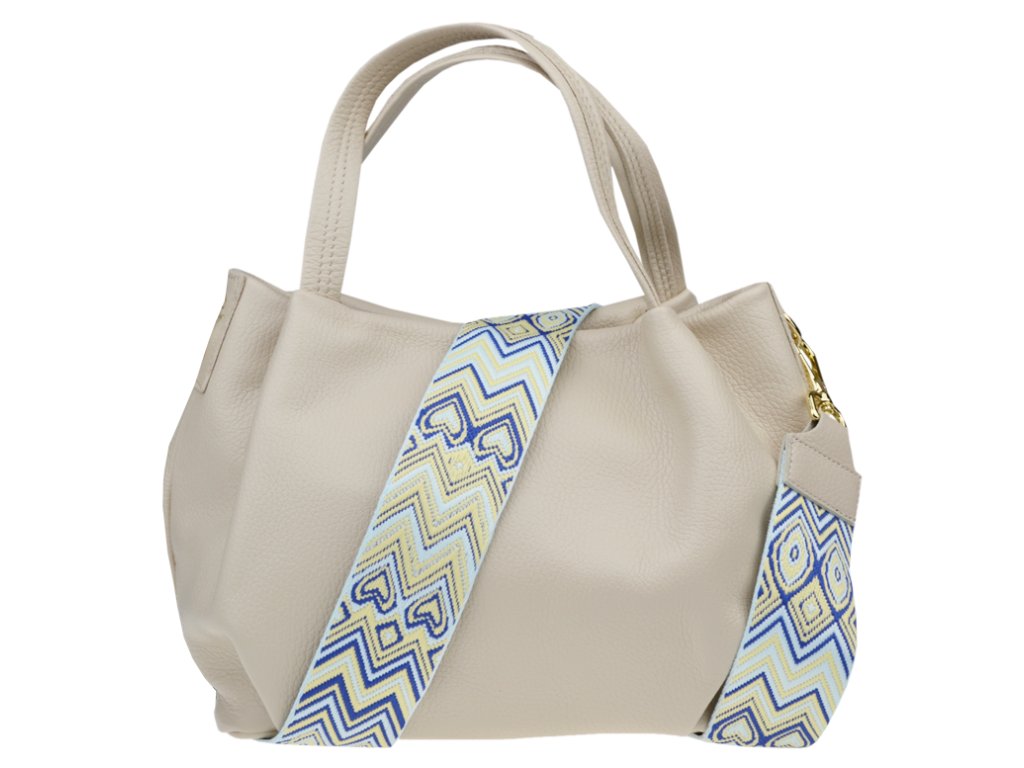 Elegantná a praktická béžová kabelka nositeľná cross-body (krížom) alebo v ruke. Táto kožená kabelka je uzatvárateľná na zips. Vnútri kabelky nájdeme na bočnej stene kapsu na zips a priehradky pre mobil či kľúče. Hĺbka jej dna je 13 cm.