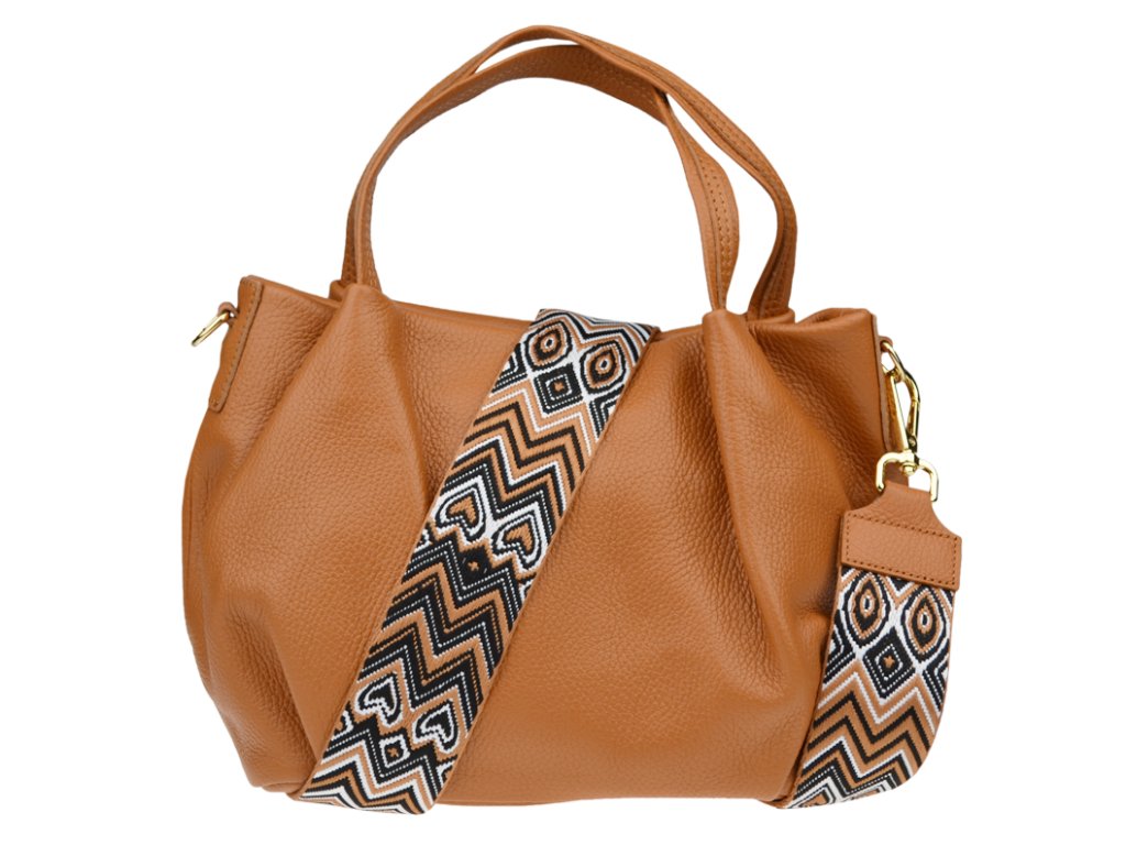 Elegantná a praktická camel kabelka nositeľná cross-body (krížom) alebo v ruke. Táto kožená kabelka je uzatvárateľná na zips. Vnútri kabelky nájdeme na bočnej stene kapsu na zips a priehradky pre mobil či kľúče. Hĺbka jej dna je 13 cm.