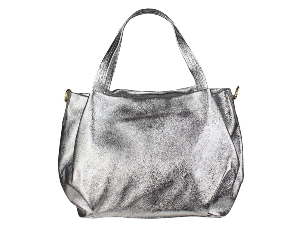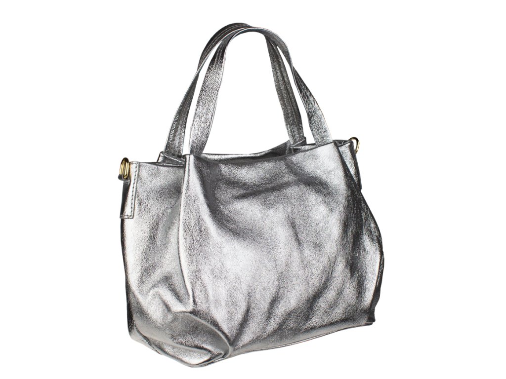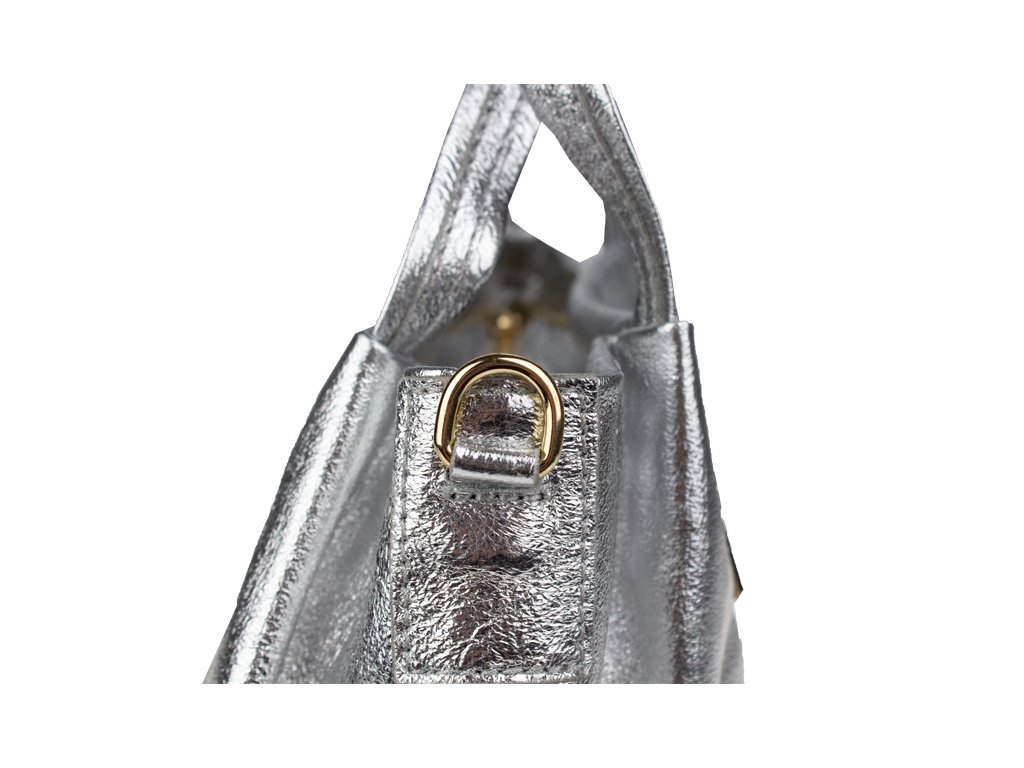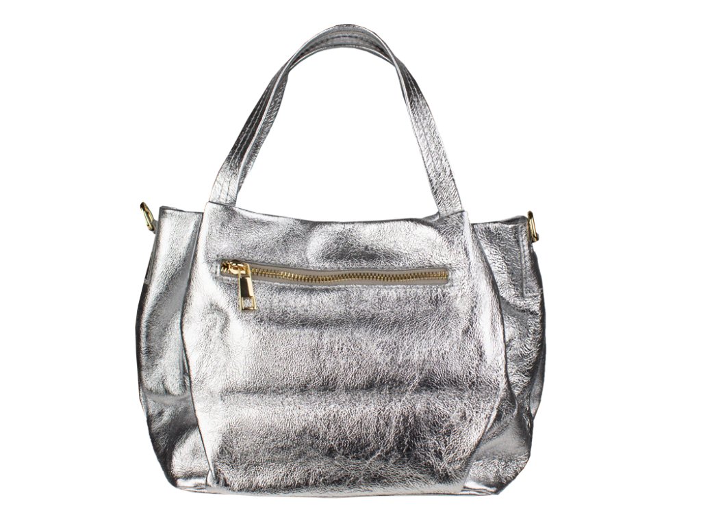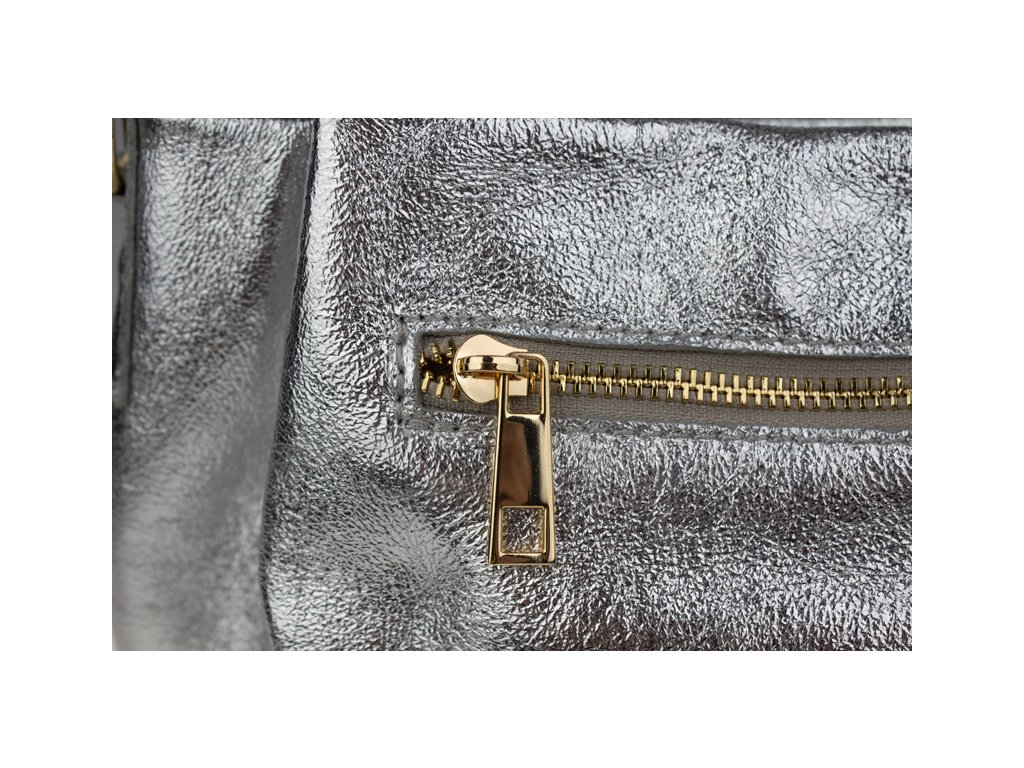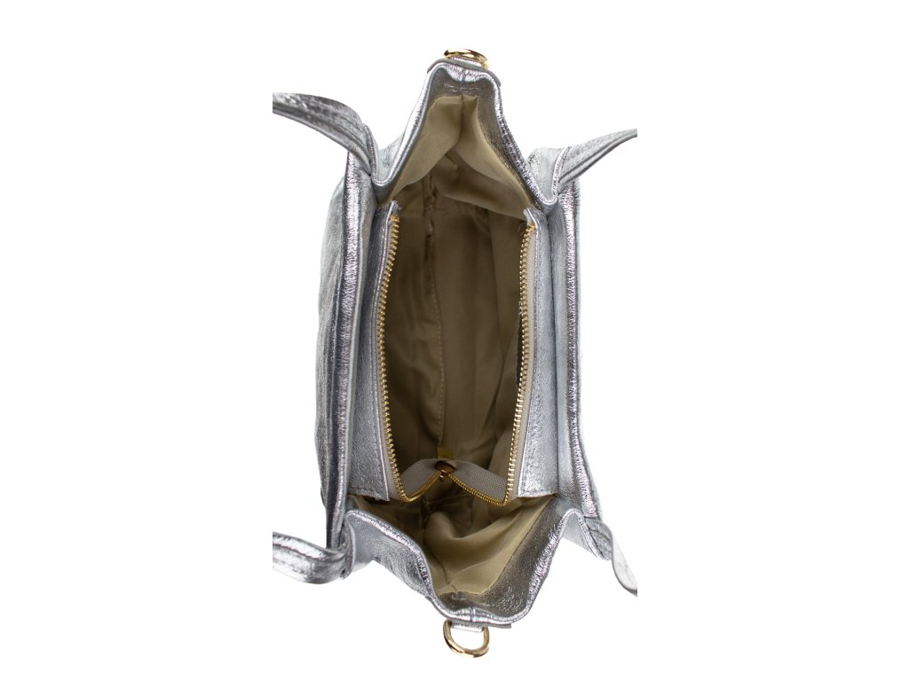 Elegantná a praktická strieborná kabelka nositeľná cross-body (krížom) alebo v ruke. Táto kožená kabelka je uzatvárateľná na zips. Vnútri kabelky nájdeme na bočnej stene kapsu na zips a priehradky pre mobil či kľúče. Hĺbka jej dna je 13 cm. Kabelka má navyše nastaviteľný popruh s maximálnou dĺžkou cca 120 cm.