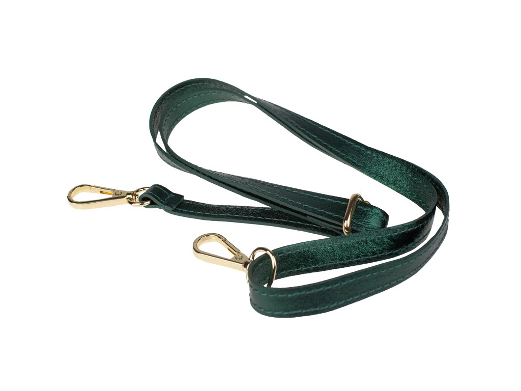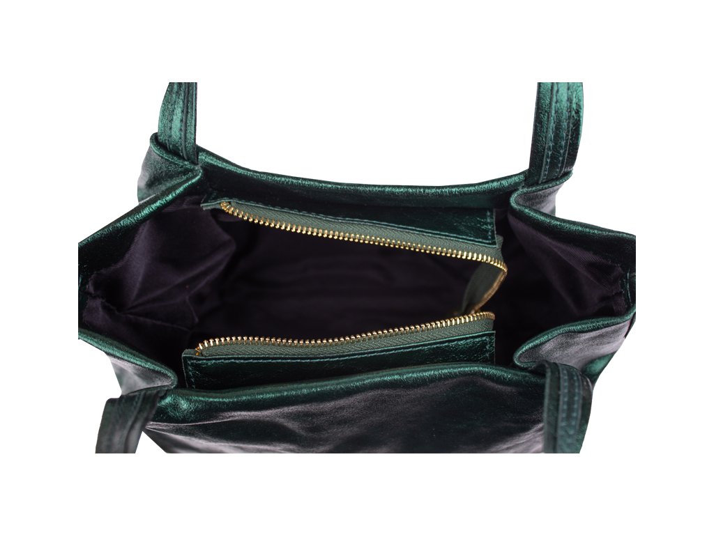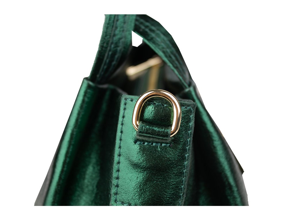 Elegantná a praktická metalicky - zelená kabelka nositeľná cross-body (krížom) alebo v ruke. Táto kožená kabelka je uzatvárateľná na zips. Vnútri kabelky nájdeme na bočnej stene kapsu na zips a priehradky pre mobil či kľúče. Hĺbka jej dna je 13 cm. Kabelka má navyše nastaviteľný popruh s maximálnou dĺžkou cca 120 cm.