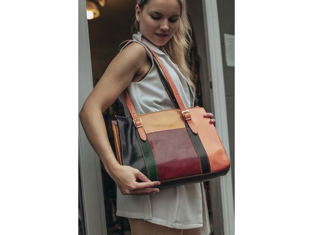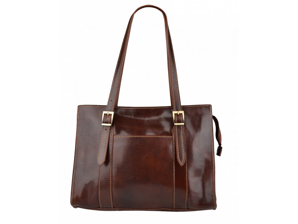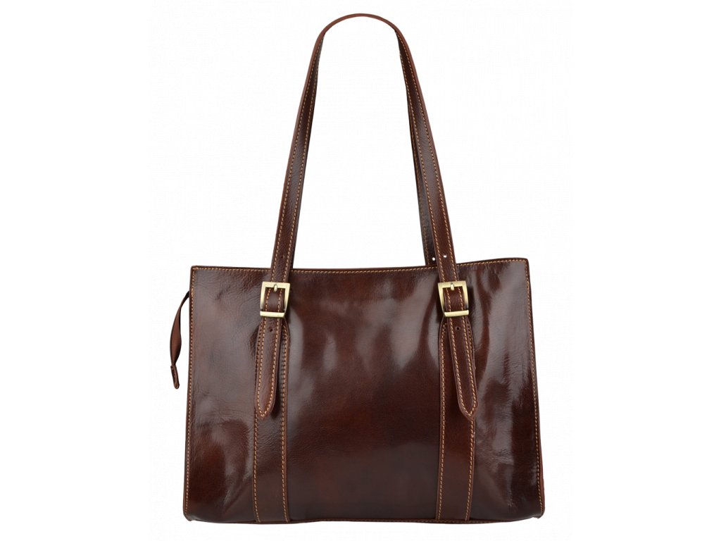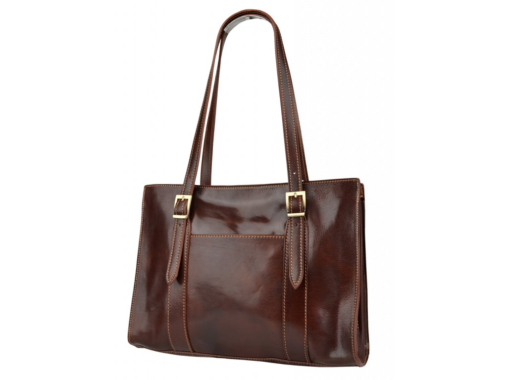 Klasická kožená kabelka v hnedej farbe. Táto priestranná kabelka je vo vnútri rozdelená prepážkou uzatvárateľnú na zips. Kabelka je vhodná pre nosenie cez rameno alebo v ruke.