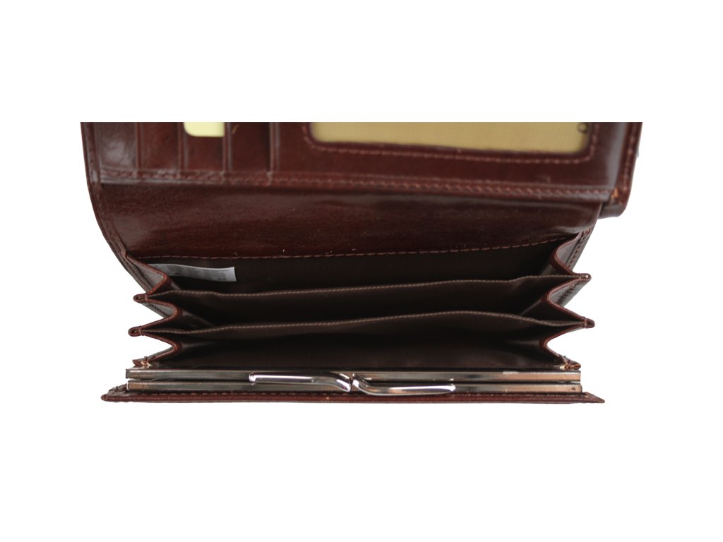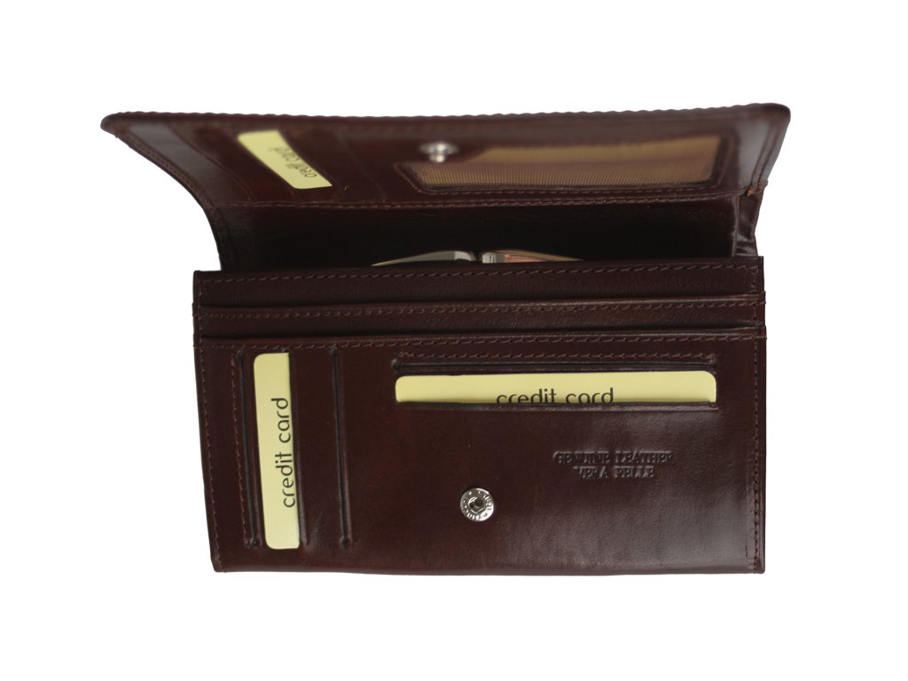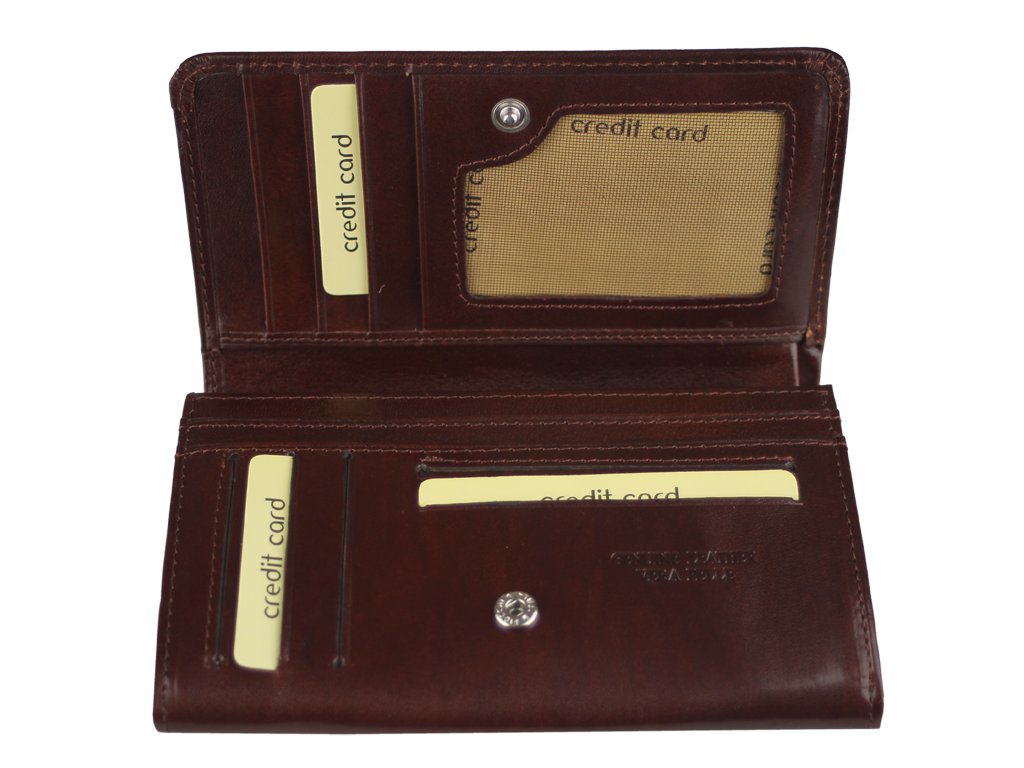 Elegantná dámska peňaženka obdĺžnikovitého tvaru. Na jednej strane vyniká svojím moderným designom a na druhej strane je veľmi praktická. Zatvára sa pomocou patentky. Disponuje 2 priehradkami na bankovky; celkom 9 priehradkami na platobné a iné karty; 4 priehradkami vhodnými pre doklady. Jedna vnútorná časť sa uzatvára pomocou patentky.