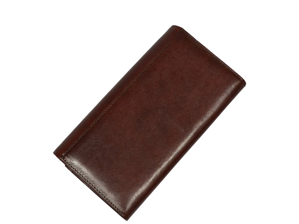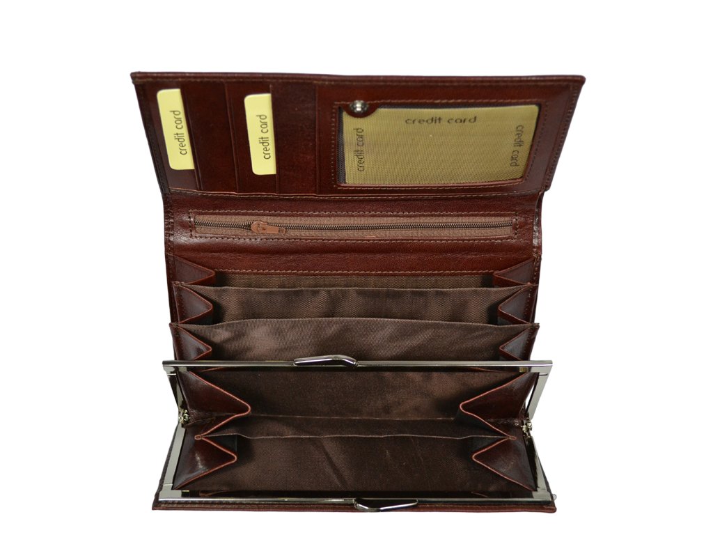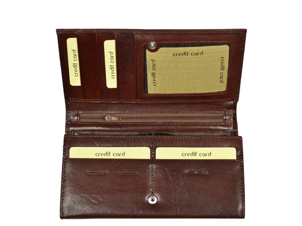 Elegantná hnedá dámska peňaženka s klasickým designom. Má podlhovastý tvar a zatvára sa pomocou patentky. Má mnoho praktických priehradok: dvojkomorovú priehradku na mince, ktorá sa tiež zatvára pomocou patentky; 3 priehradky formátu bankoviek; vrecko na zips a 9 miest na platobné a iné karty. K tomu všetkému má zadnú neuzatvárateľnú priehradku, ktorá má takmer rozmer formátu A5.