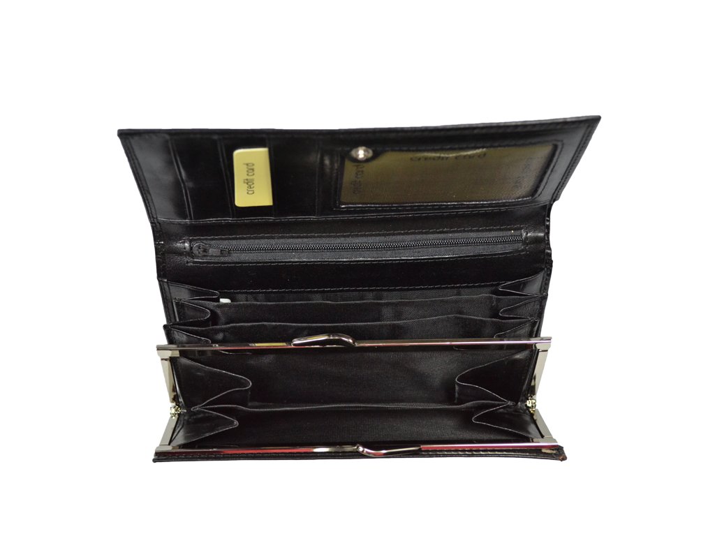 Elegantná dámska peňaženka s klasickým designom v čiernom prevedení. Má podlhovastý tvar a zatvára sa pomocou patentky. Má mnoho praktických priehradok: dvojkomorovú priehradku na mince, ktorá sa tiež zatvára pomocou patentky; 3 priehradky formátu bankoviek; vrecko na zips a 9 miest na platobné a iné karty. K tomu všetkému má zadnú neuzatvárateľnú priehradku, ktorá má takmer rozmer formátu A5.