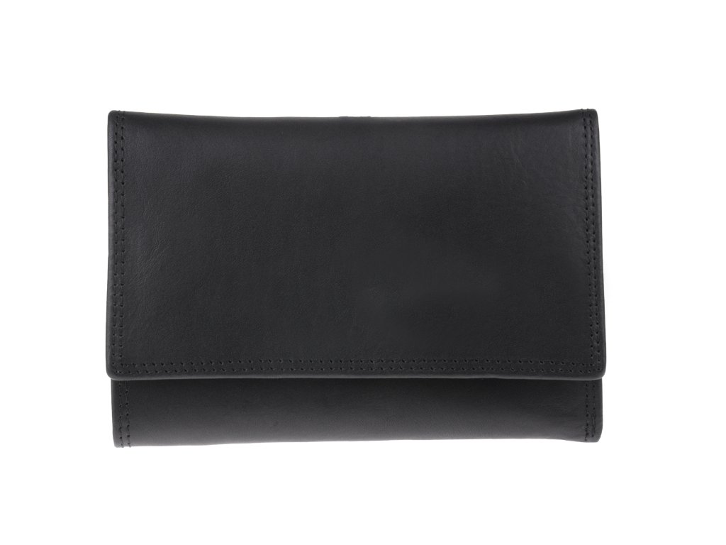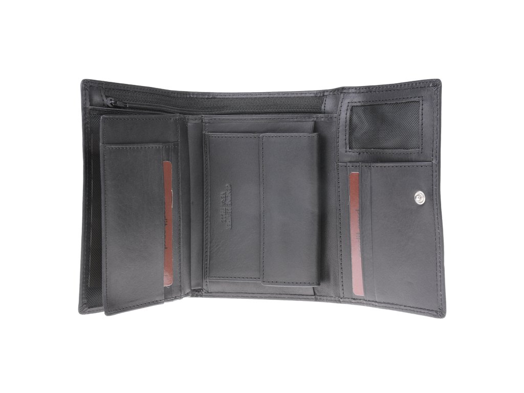 Elegantná dámska peňaženka s moderným designom v čiernej farbe. Má mierne obdĺžnikovitý tvar a zatvára sa pomocou patentky. Vďaka veľkej ponuke priehradok je veľmi praktická: priehradka na mince, na bankovky, uzatvárateľná priehradka, ďalších 5 priehradok vhodných na doklady a šesť na platobné a iné karty. Táto peňaženka je moderná a vhodná na všestranné použitie.